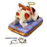 I think this puppy is in Doggie Heaven - he has all the shoes he will ever want to chew! He is mostly white with some big brown spots and lovely pink angel wings. He has a metal halo circling his head while his mouth is full of a tasty shoe! The base is a blue sky with golden accents and another shoe is sketched inside. The box is marked Artoria Peint Main, Limoges France and is signed and numbered by the artist. Approximate size is 2½ x 2¼ inches.